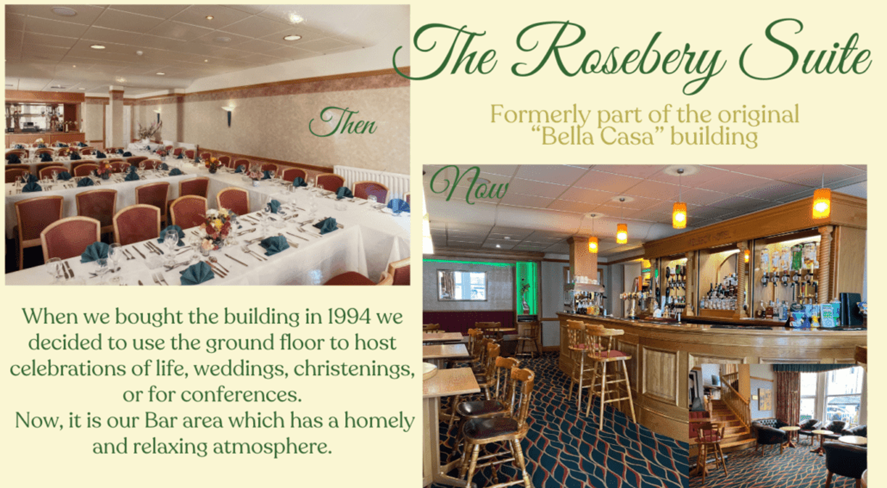 The hotel has 27 en-suite rooms today and 7 self-catering holiday let apartments, having expanded over time, including the acquisition and conversion of adjacent properties like The Bella Casa Hotel and The Granada Apartments. These additions reflect the family's commitment to growing their hospitality business while maintaining personal family traditions.