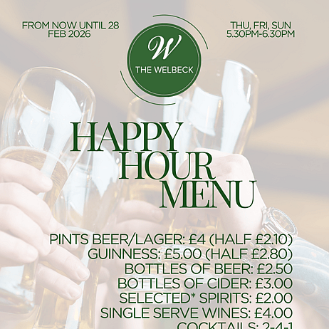 We are open early afternoon until late. Pop in for our Happy Hour 5.30-6.30pm Thu, Fri & Sun!